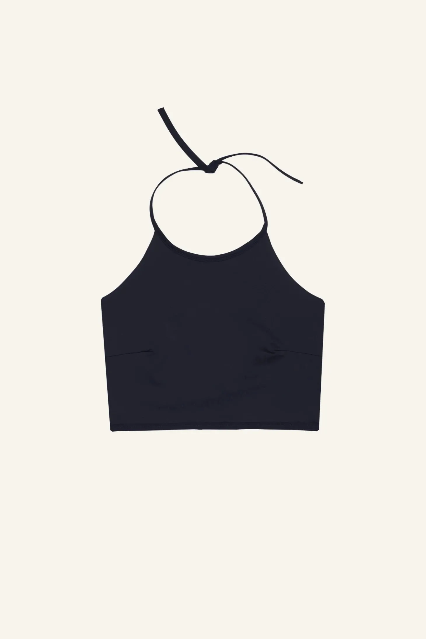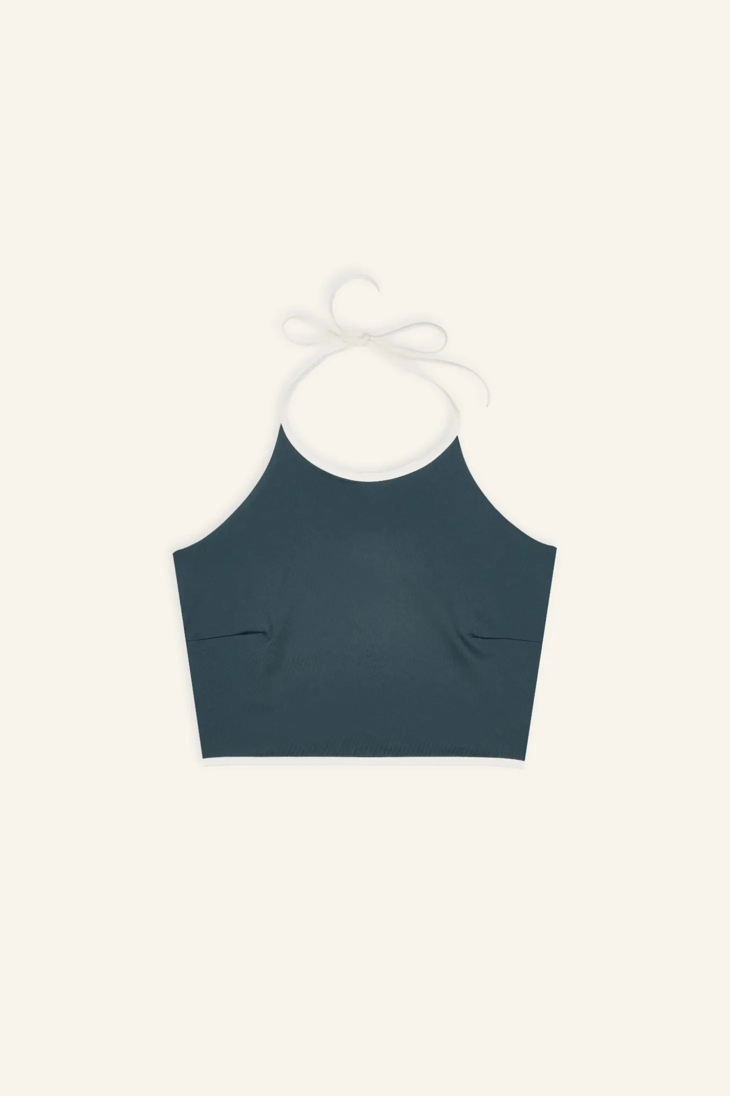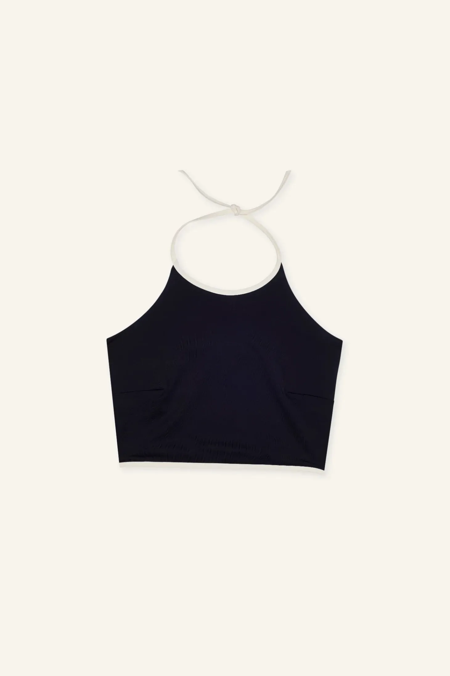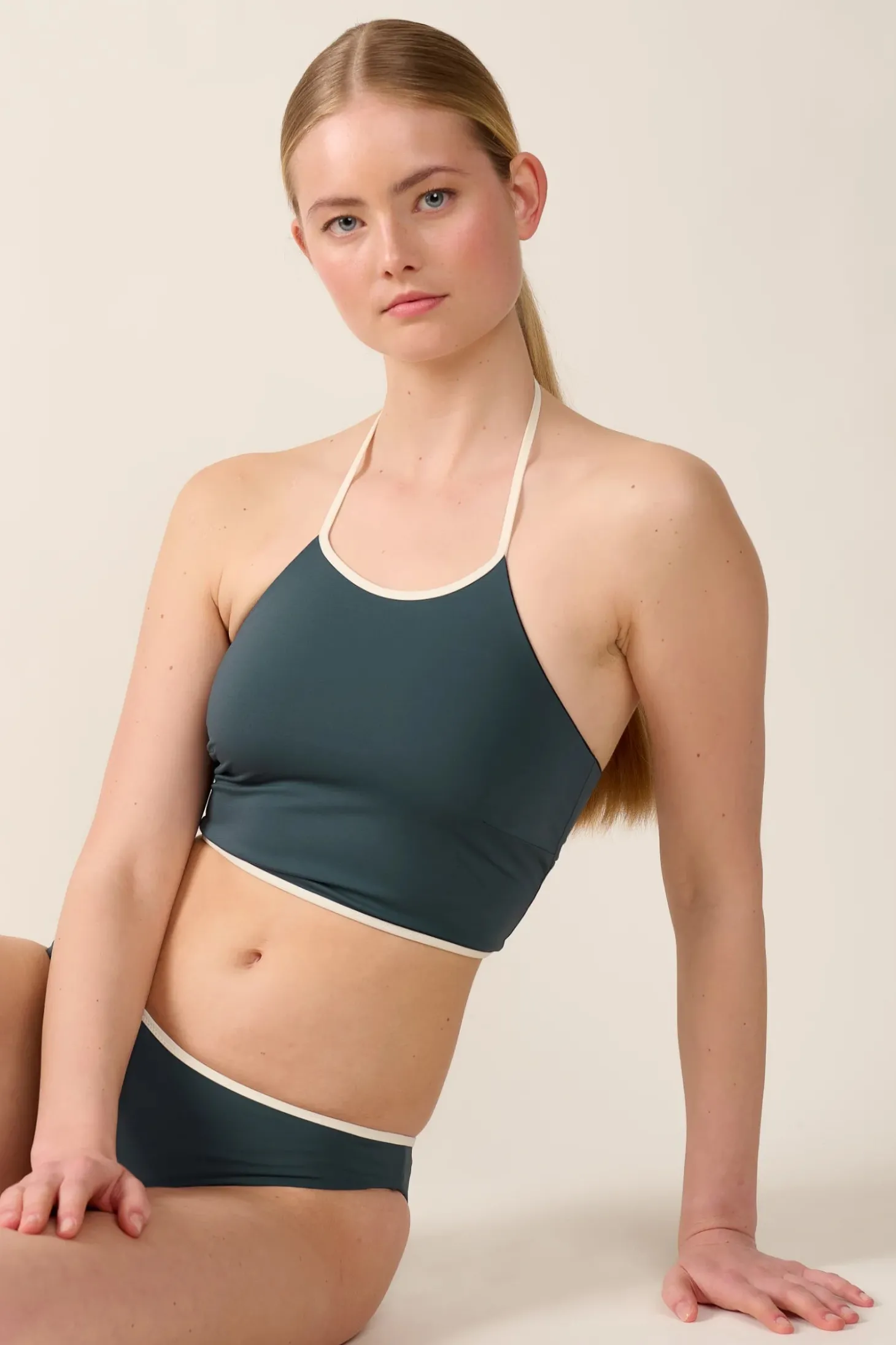 A reinterpreted classic and we love it! The high neckline and the ribbon in the neck make this bikini top a very modern and sporty looking piece. It’s reversible and you can mix and match it with all bikini pants from the Classics collection.