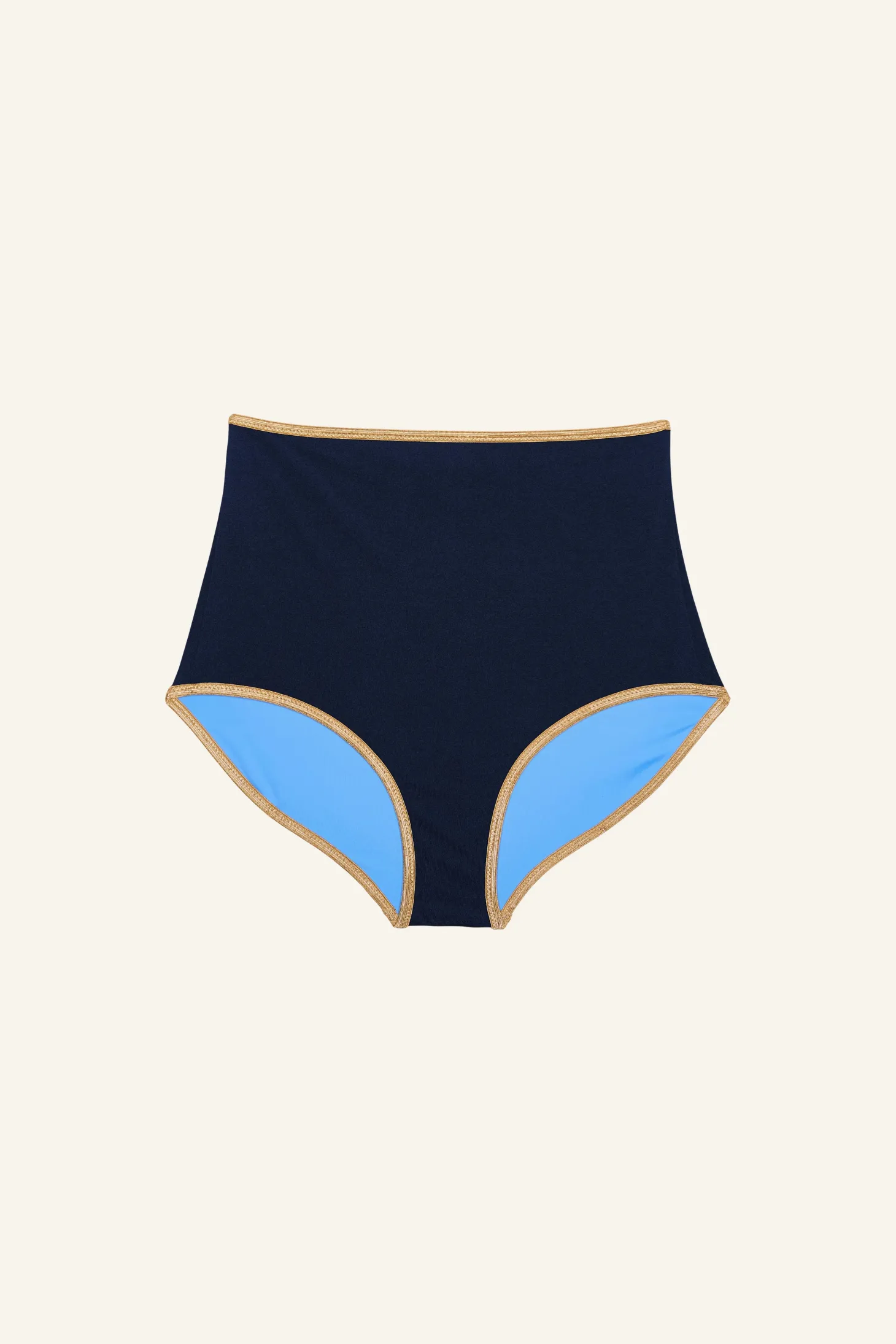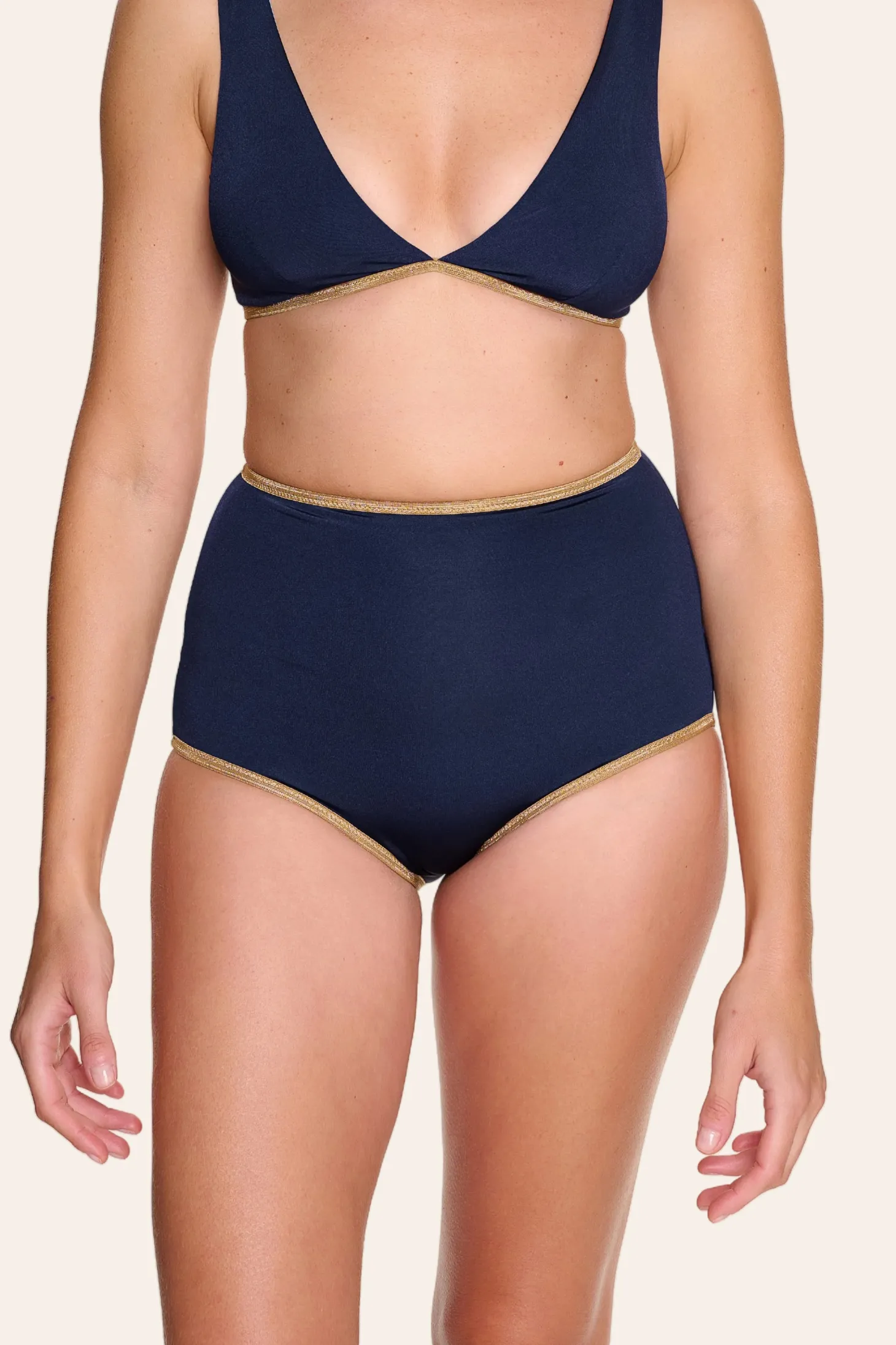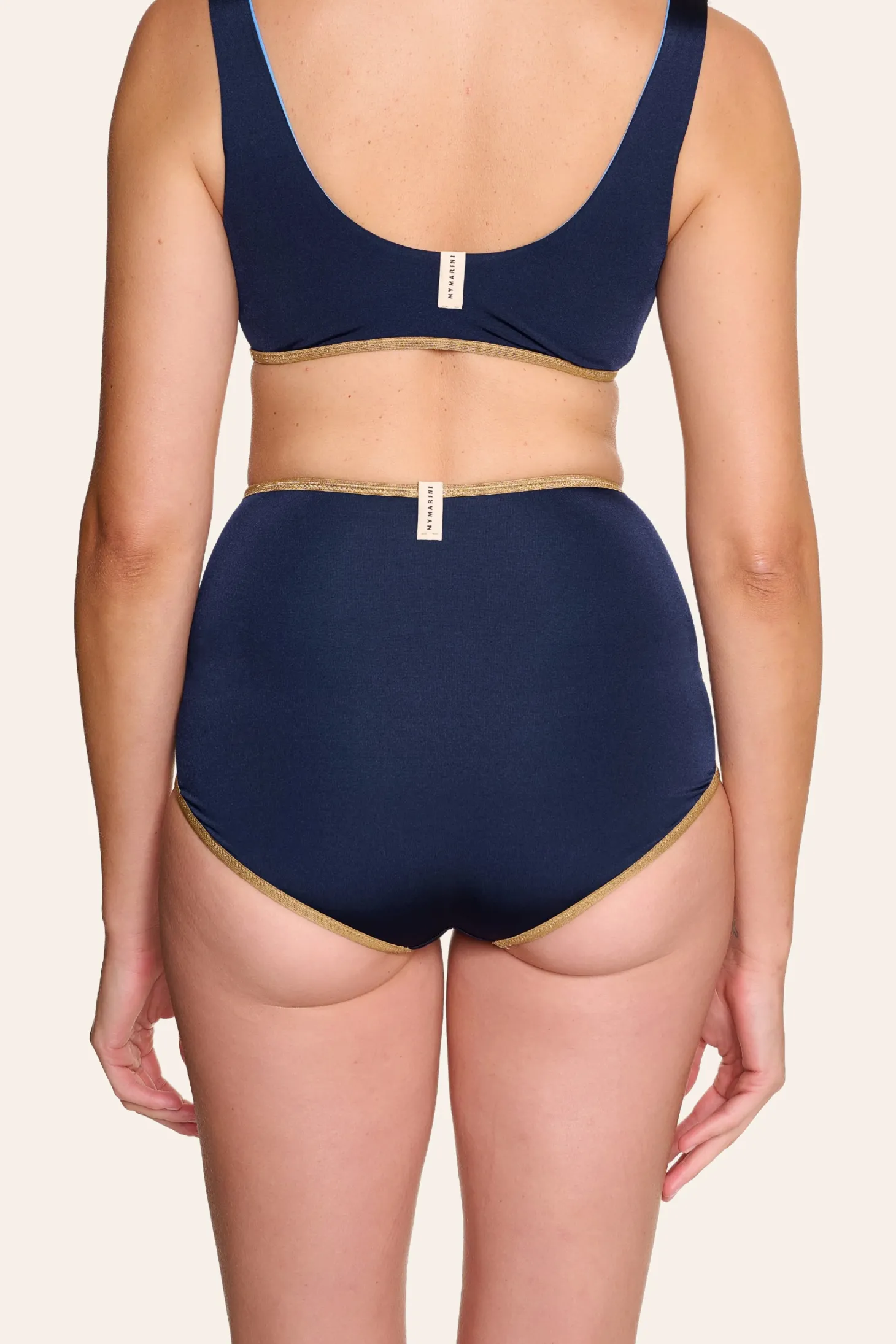 Feminine, elegant, and comfortable. The cut of our HIGHWAIST SHORTS ensures that you feel particularly comfortable. The high-waisted bikini bottom accentuates the waist with the delicate gold band and can be combined with any bikini top from the SHINE collection.