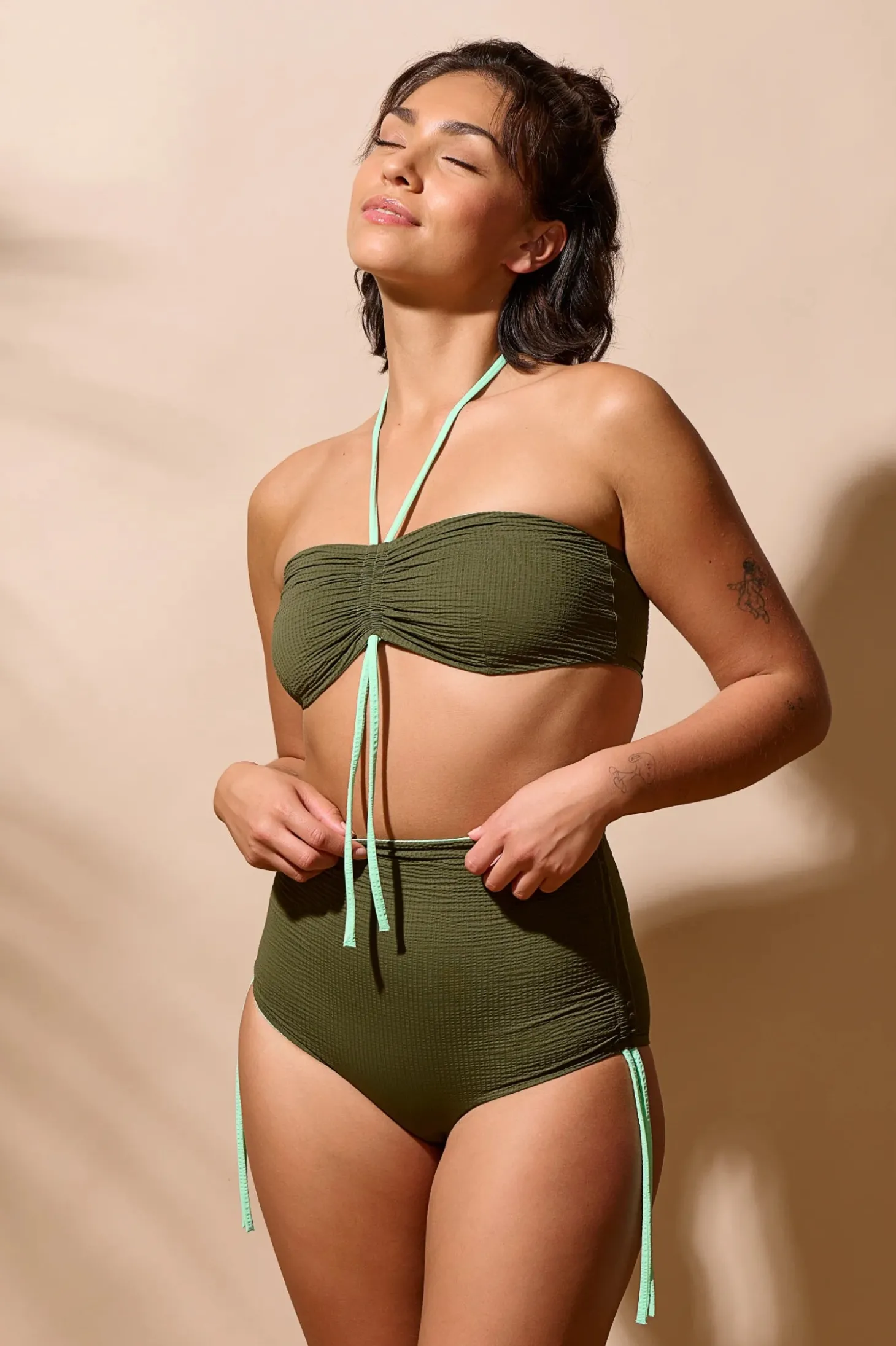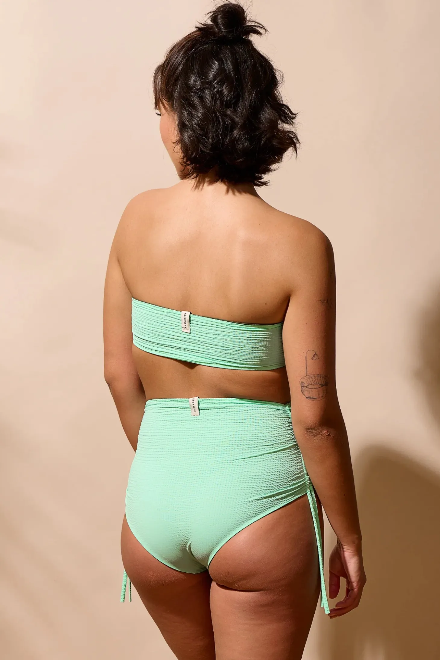 Meet our RUFFLED HIGHWAIST SHORTS: high-waisted bikini bottoms with adjustable side ruching for a totally personalized fit. Made from a soft and comfortable fabric with a delicate waffle texture, they effortlessly combine style and comfort. Pair them with any matching bikini top from the SUNNY SIDE collection for a playful summer look.
