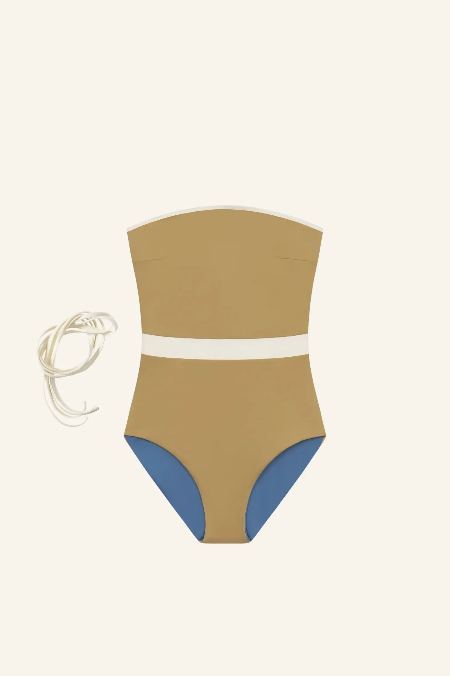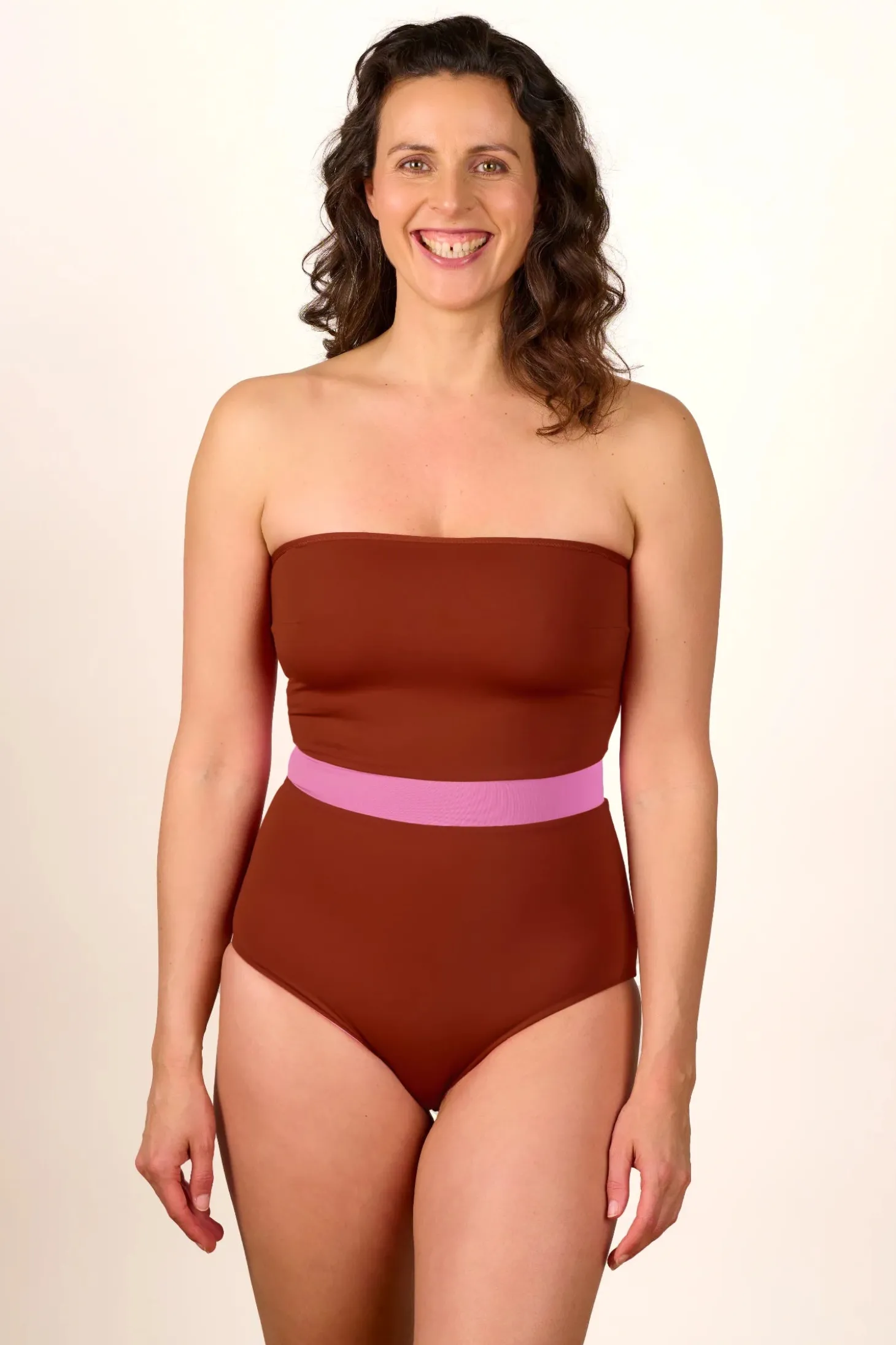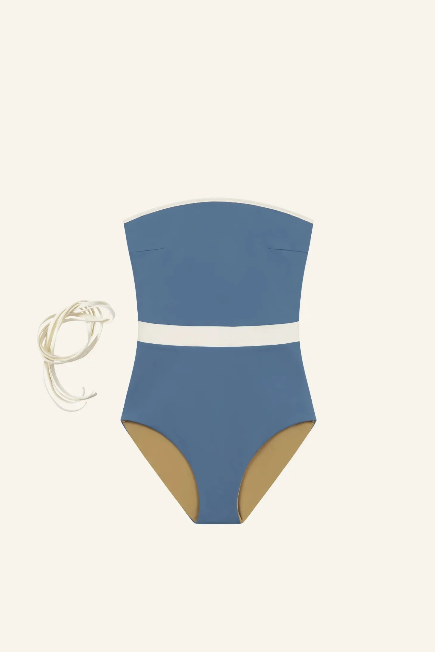 Our strapless swimsuit, the BANDEAUSUIT, elegantly highlights your shoulders and arms. The contrasting waistband accentuates the soft hourglass silhouette and adds a modern touch. Includes a removable strap that allows you to transform the swimsuit in several ways – perfect for added support whenever you need it.