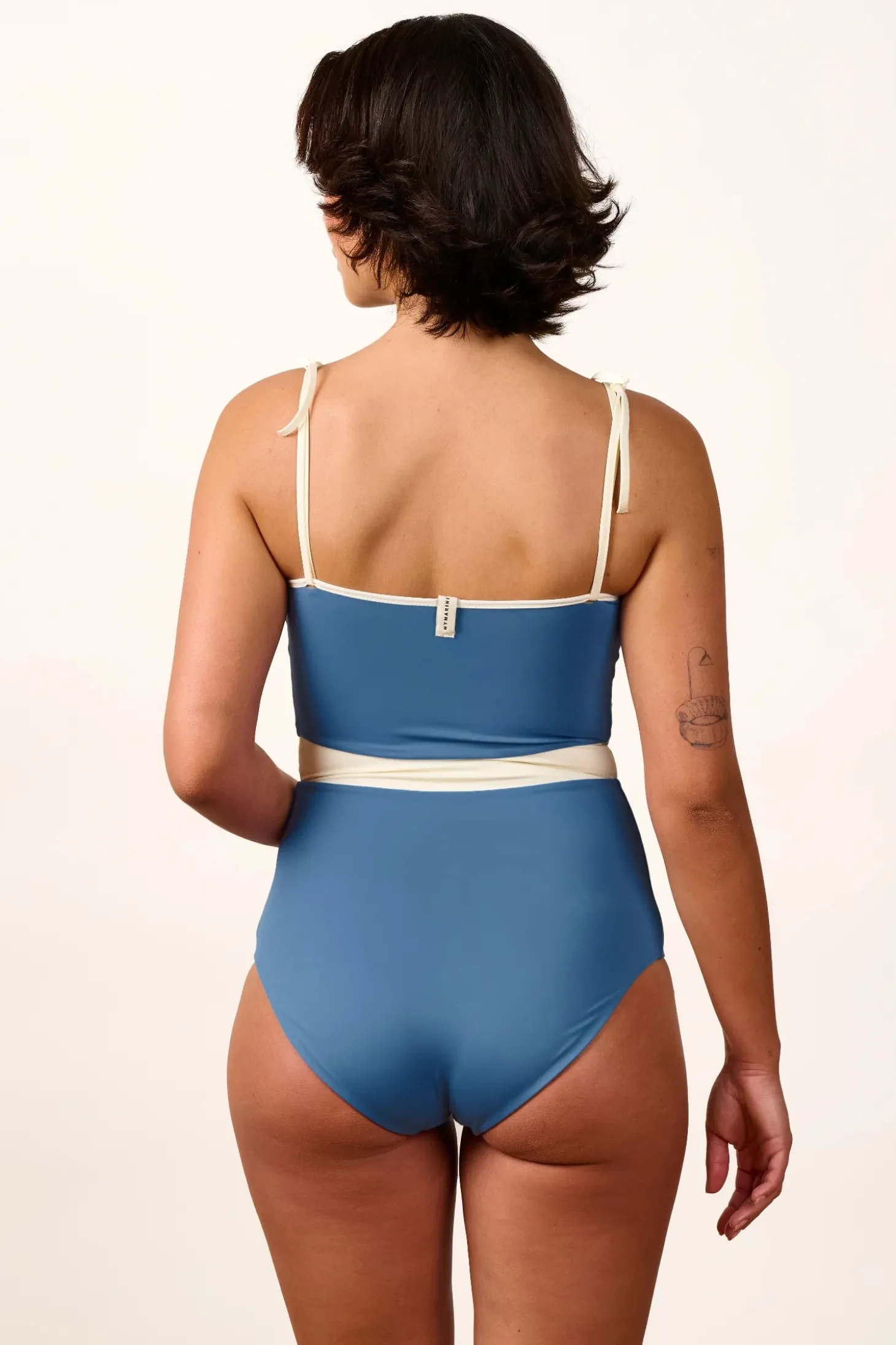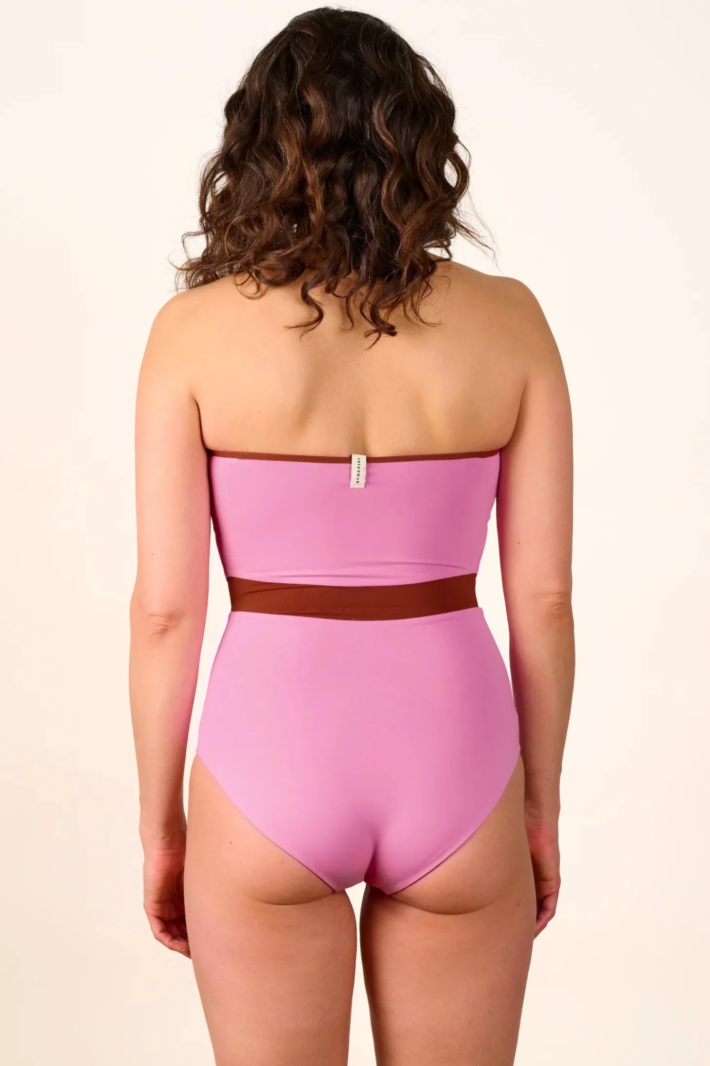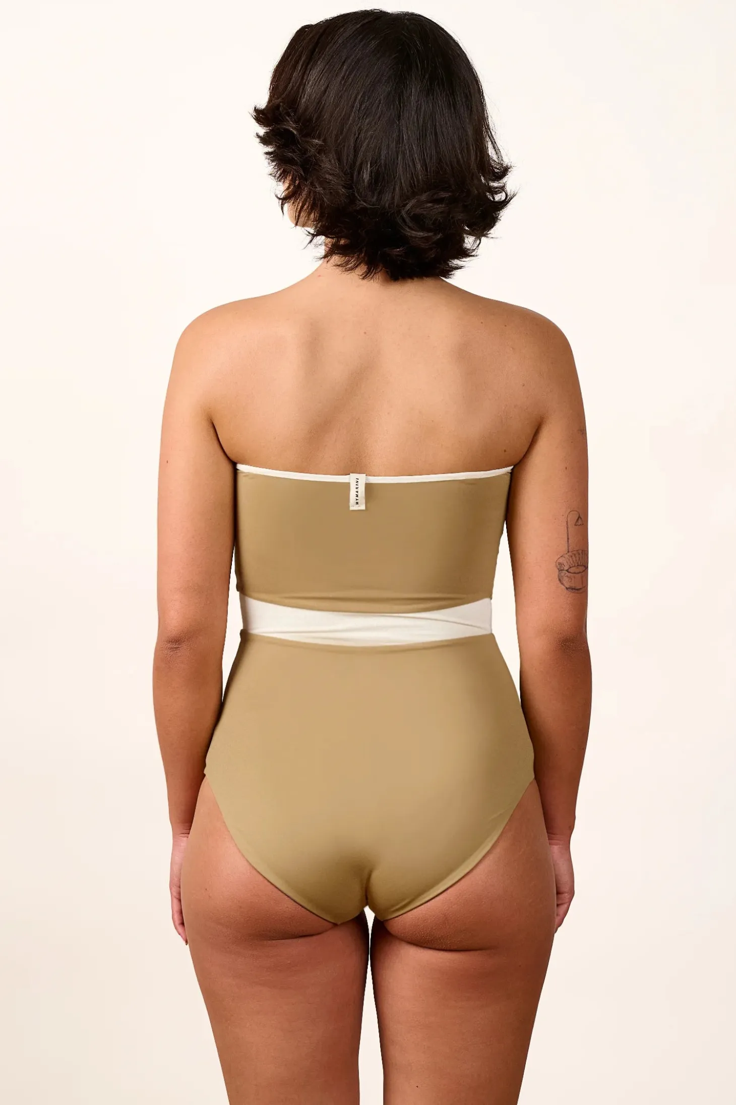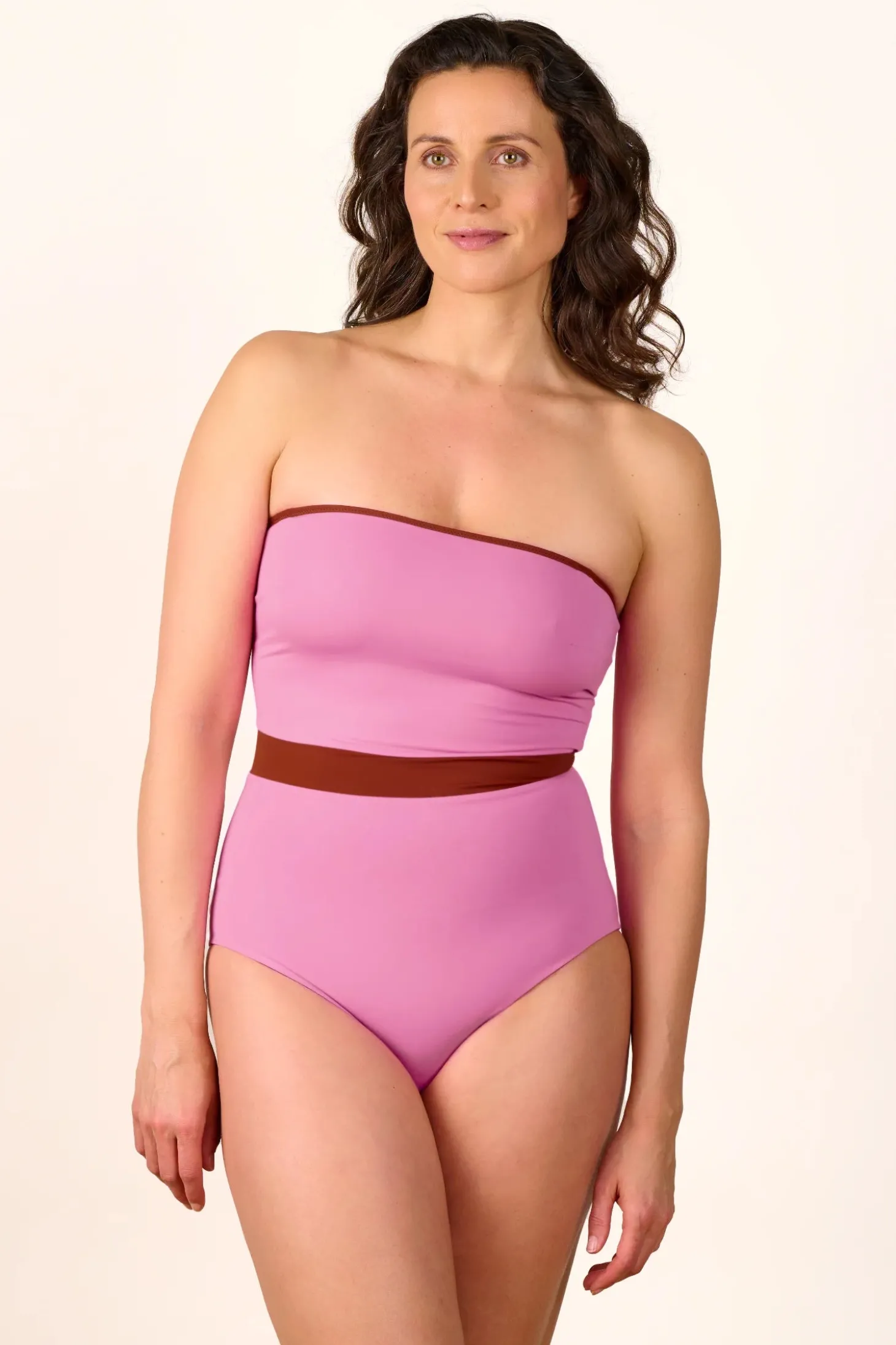 Our strapless swimsuit, the BANDEAUSUIT, elegantly highlights your shoulders and arms. The contrasting waistband accentuates the soft hourglass silhouette and adds a modern touch. Includes a removable strap that allows you to transform the swimsuit in several ways – perfect for added support whenever you need it.
