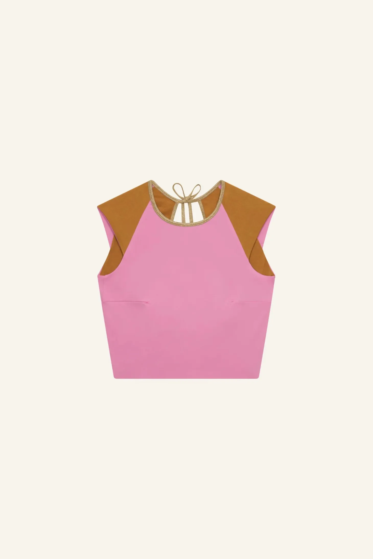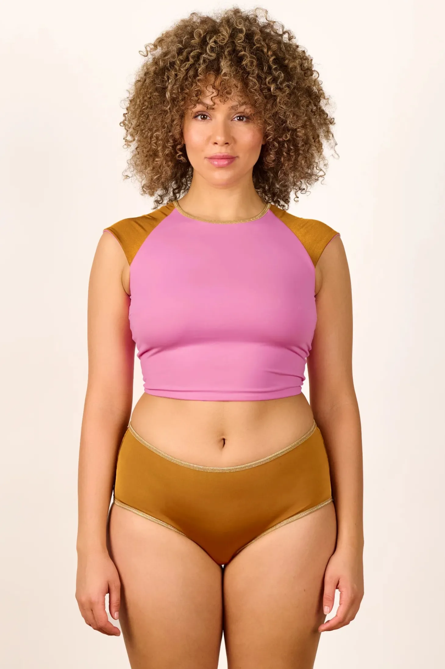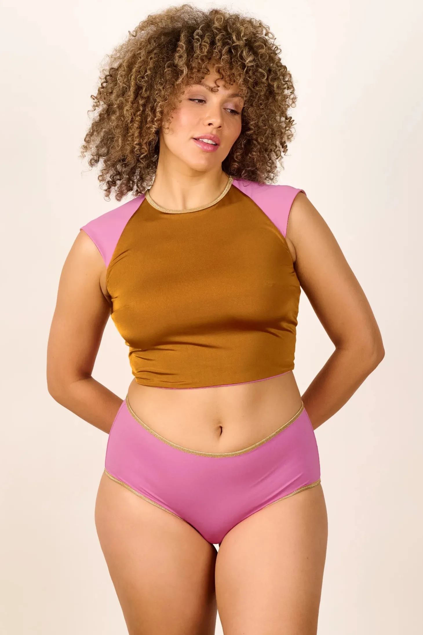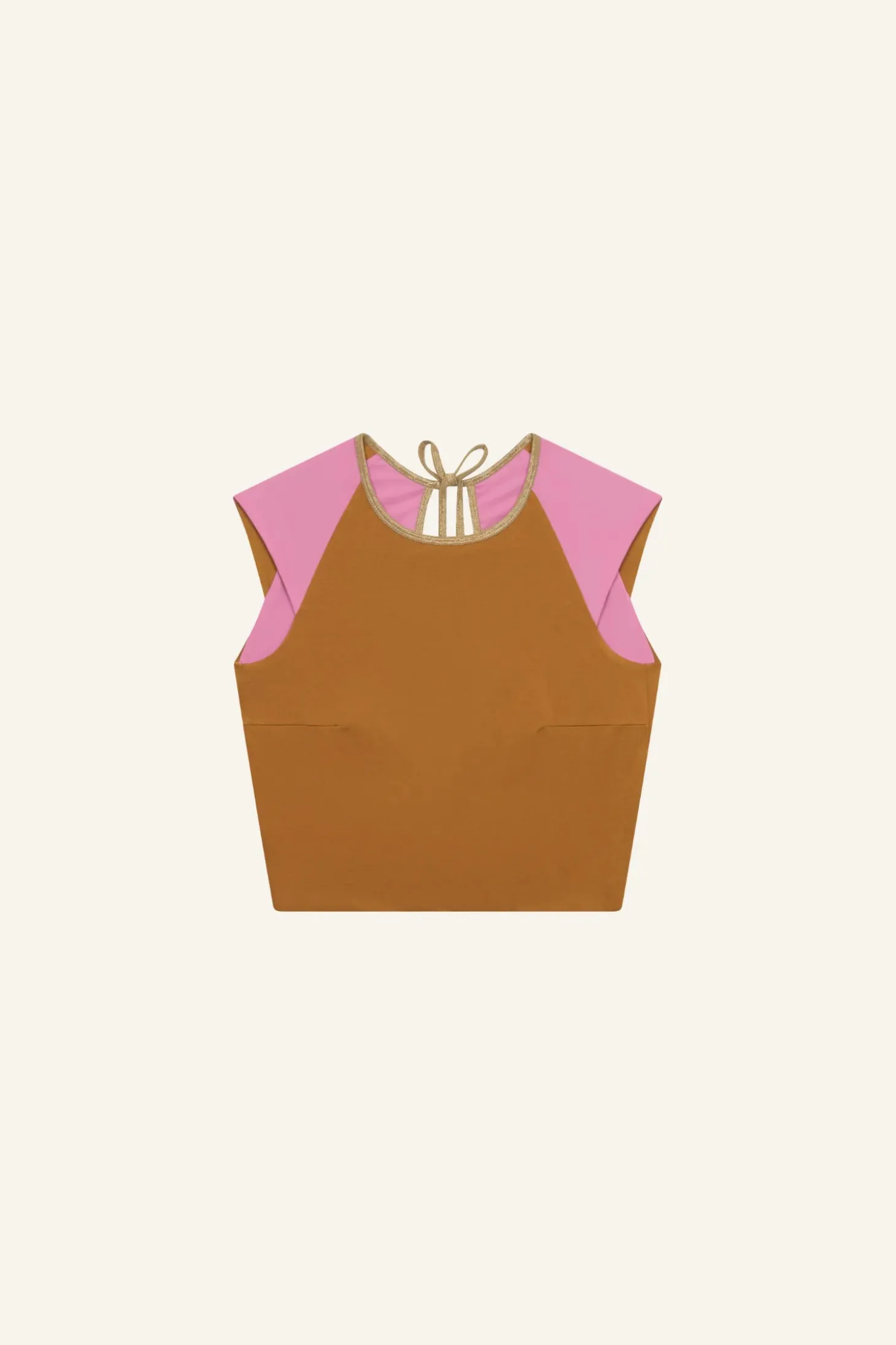 Our new OCEAN TOP SHINE combines style and functionality in a modern design. Its crop-top length and high neckline provide secure coverage and a sleek look. The cap sleeves extend to the shoulders, creating a classic, elegant silhouette. At the back, a gracefully rounded keyhole cut-out is accented by the golden SHINE tie closure. Perfect for relaxing summer days or active moments by the water; you can wear the OCEAN TOP as part of a bikini or as an everyday top.