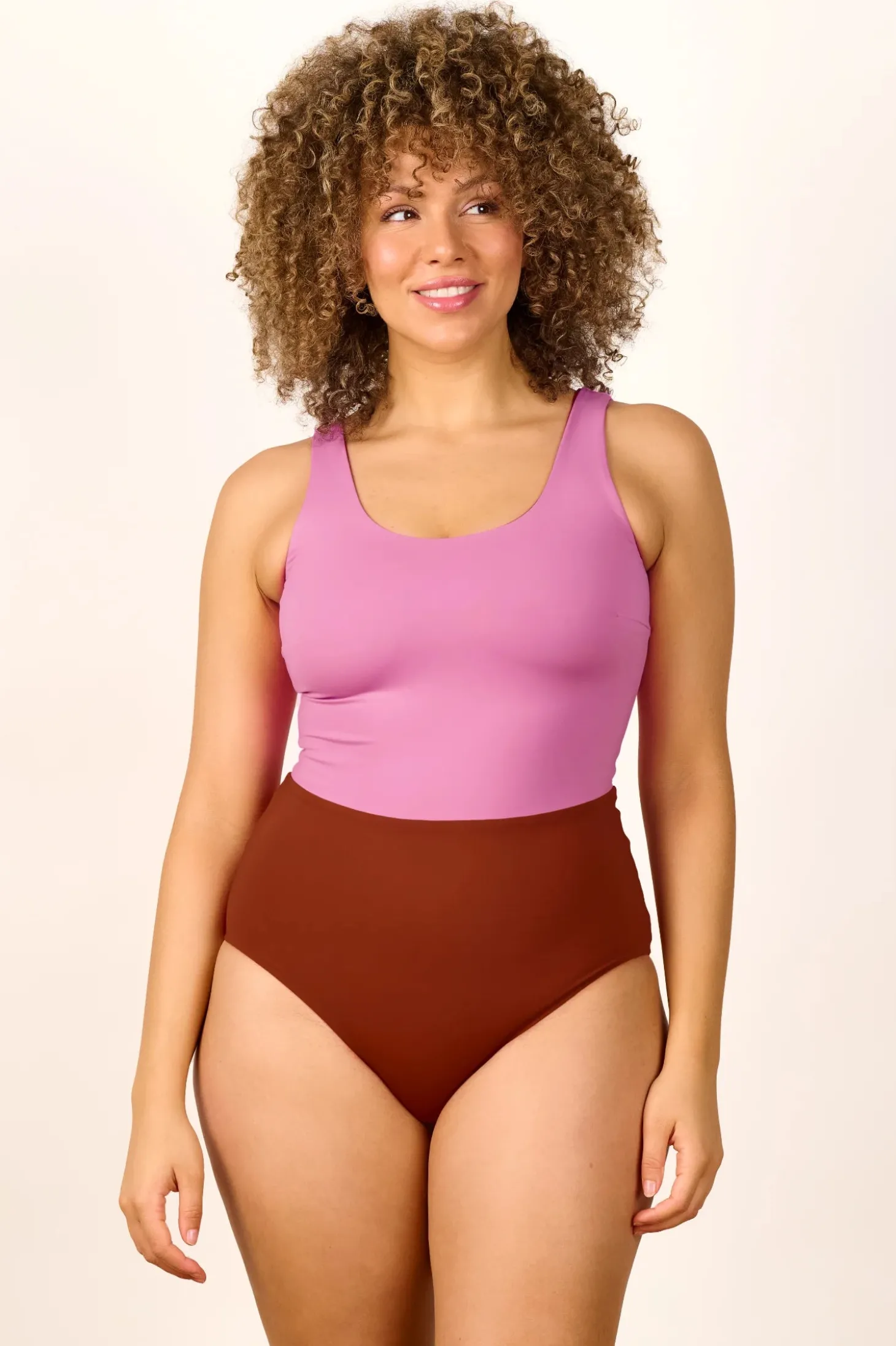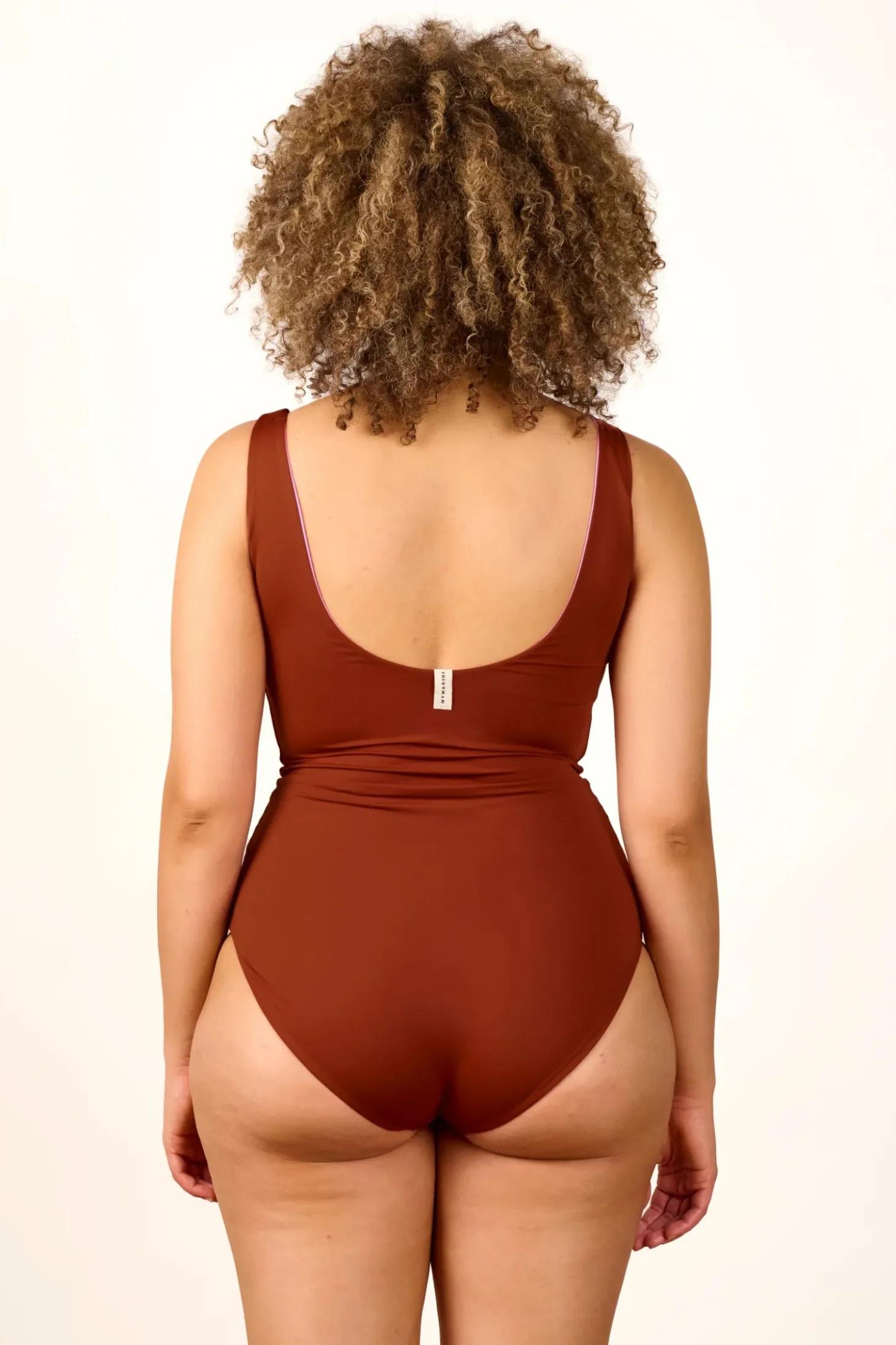 Our PLAINBODY swimsuit is timeless. Its minimalist design features a gently curved neckline paired with a matching scoop back. The moderately high-cut legs and wide shoulder straps ensure optimal support and exceptional comfort, making it perfect for exercising as well as relaxing. Subtle seaming at the waist enhances the silhouette, while the reversible two-tone design adds versatility and style to this modern classic.