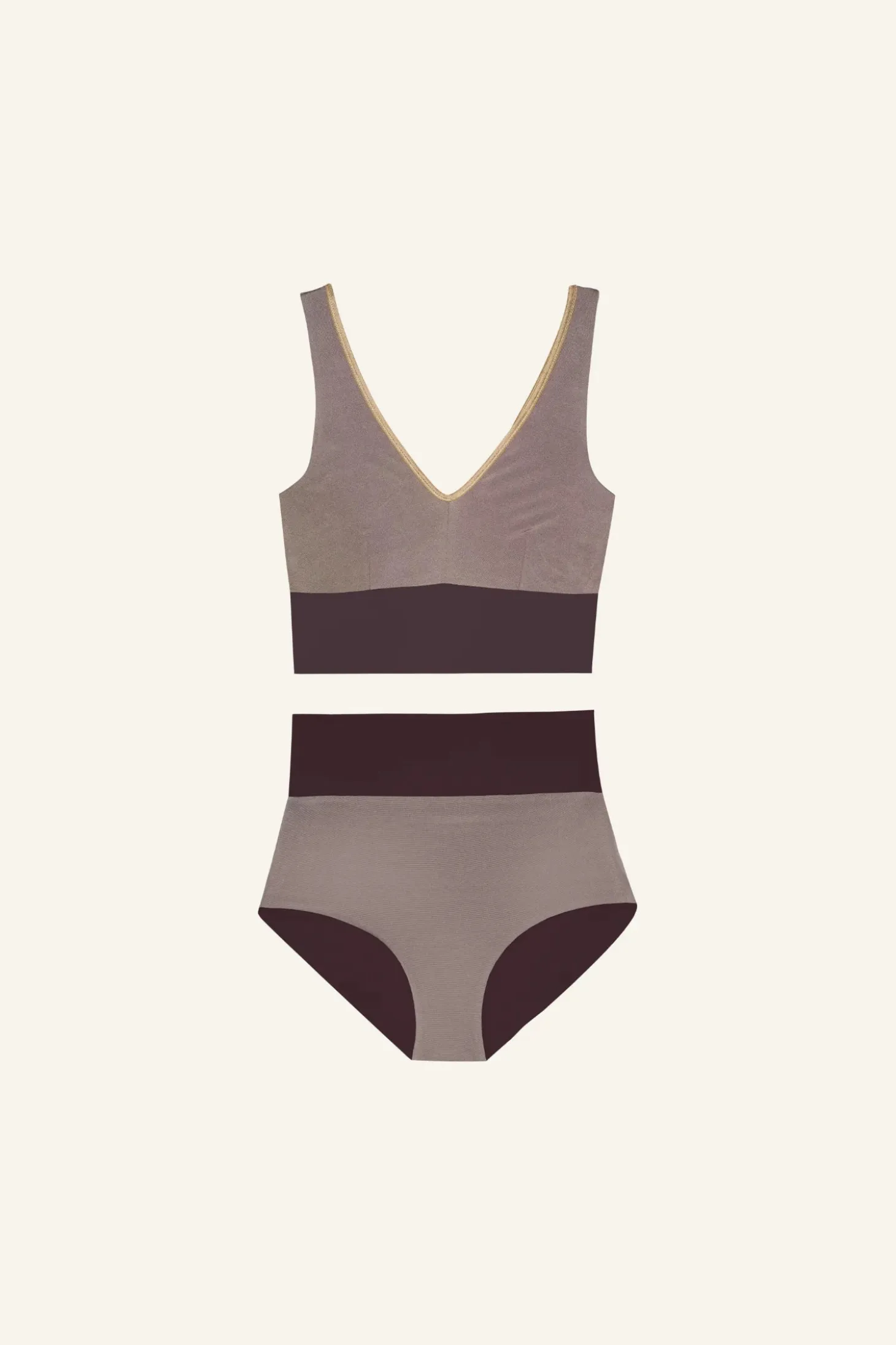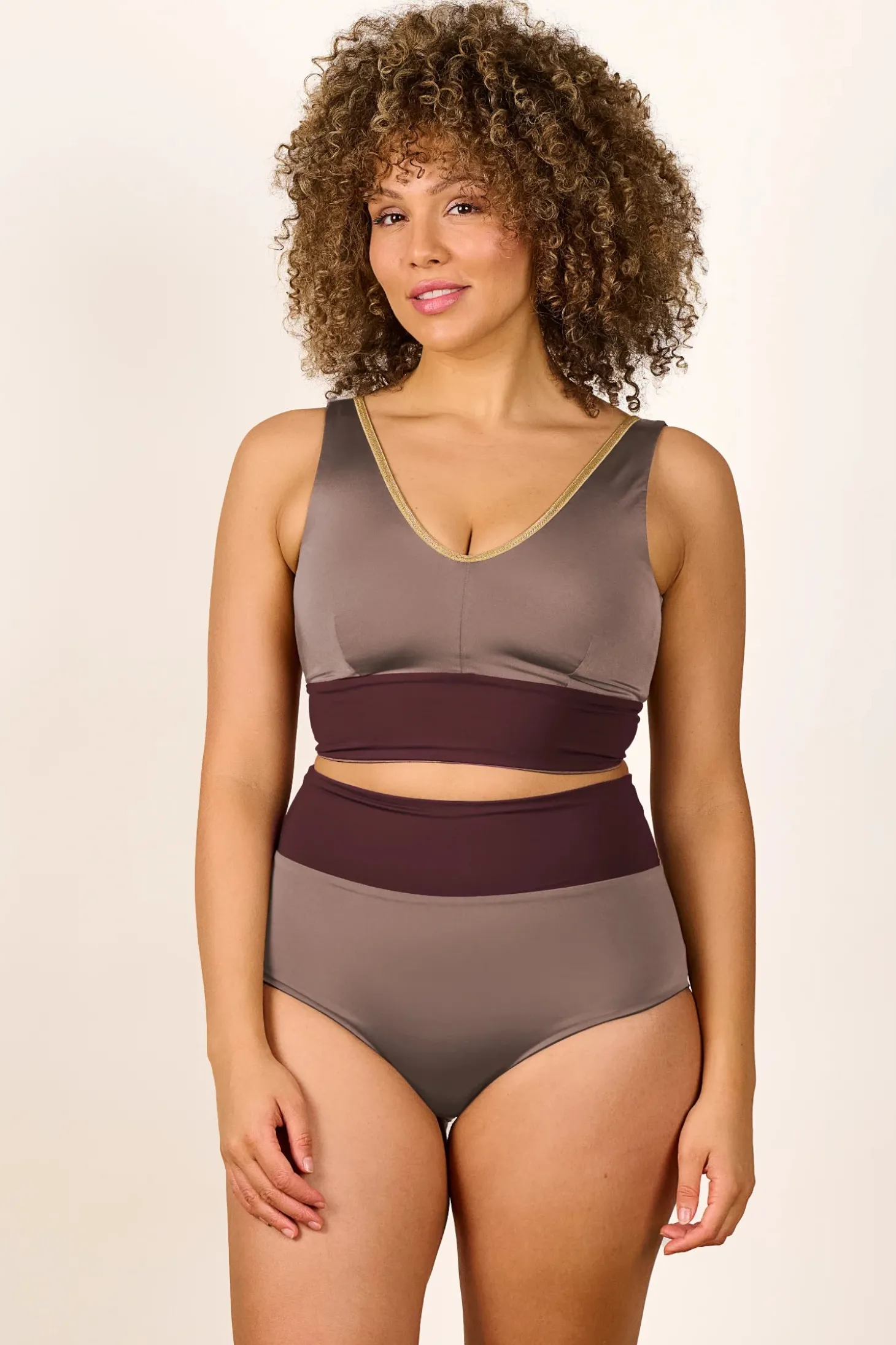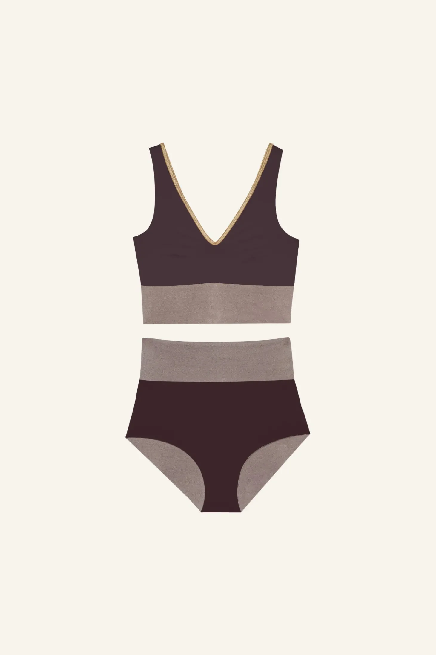 The shimmery YOGA SET features a modern and sporty design with a sleek color-blocked pattern. The V-neck bikini top has wide straps for support, offering a flattering yet functional fit, while the high-waisted bottom provides great sun coverage. The muted colorways feature contrasting horizontal bands and delicate golden SHINE trim for a chic and structured appearance. The overall style of this bikini is minimalistic yet elegant, making it a great choice for relaxing and active beach days alike — and it’s reversible, so you get two unique looks in one.