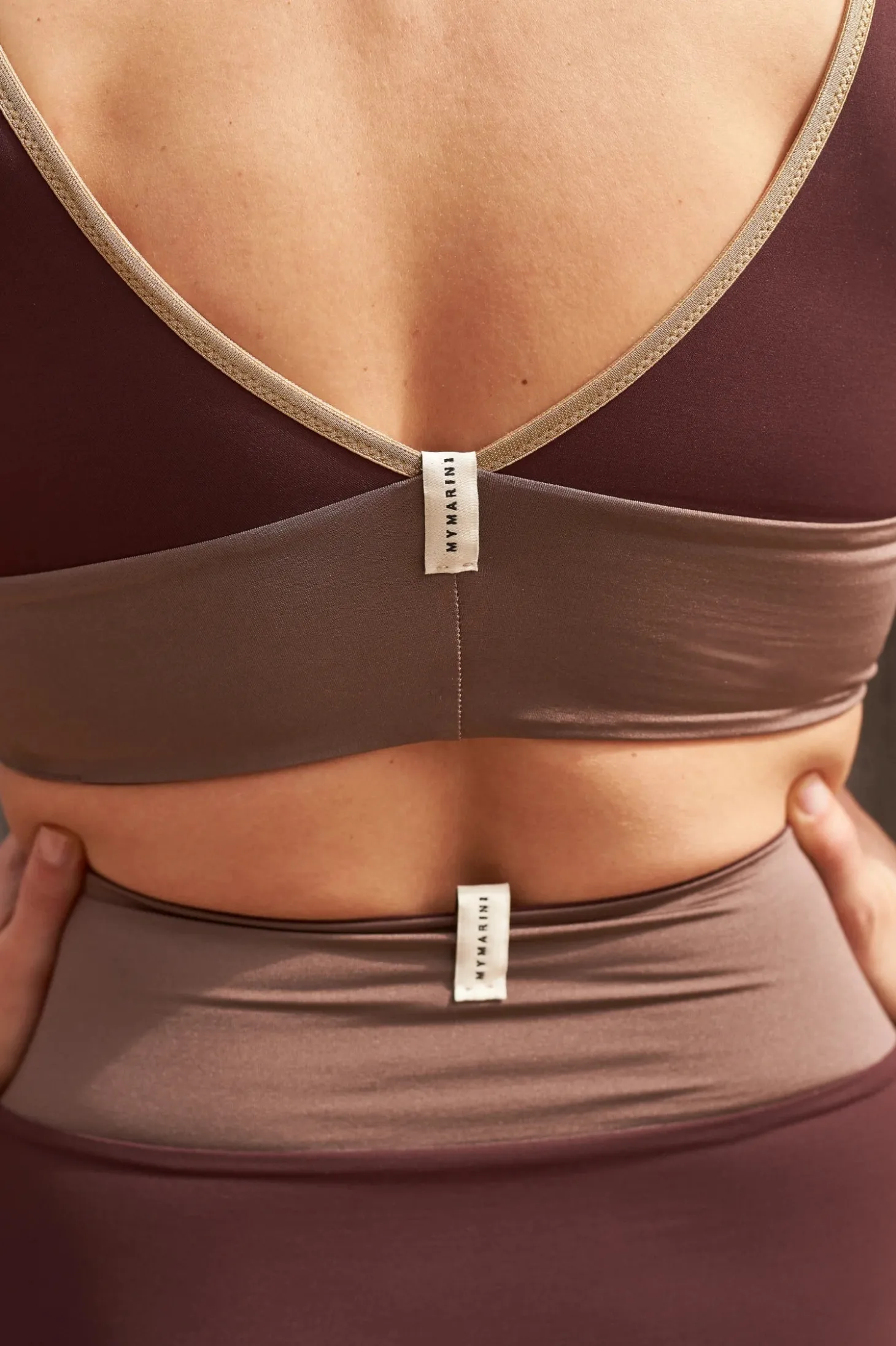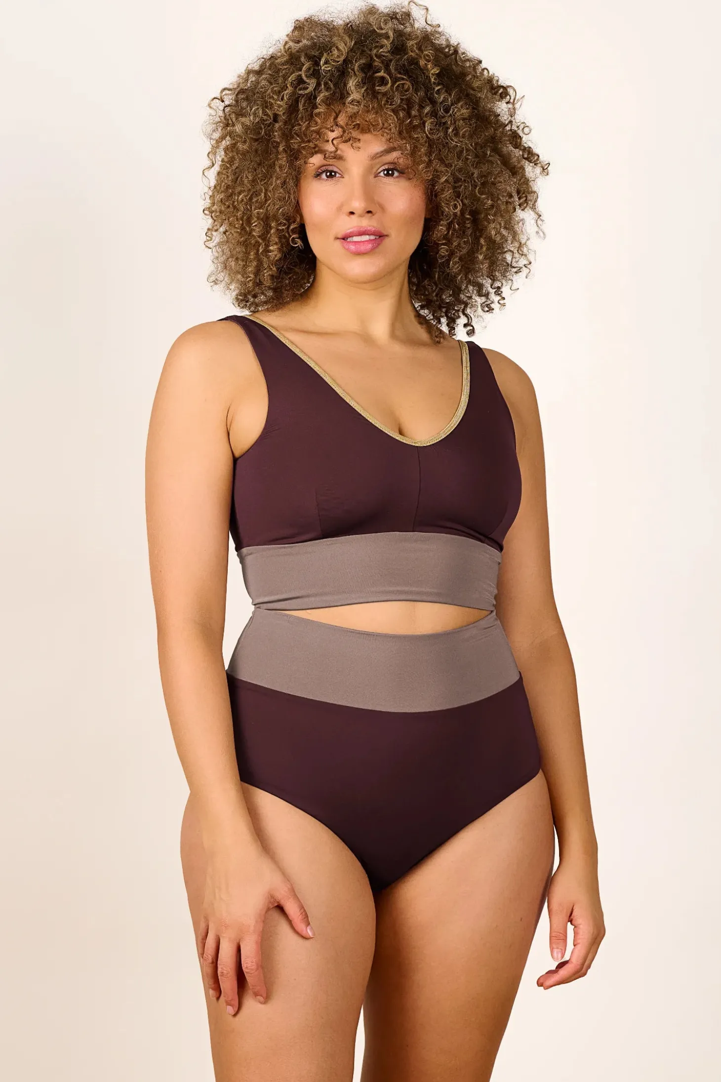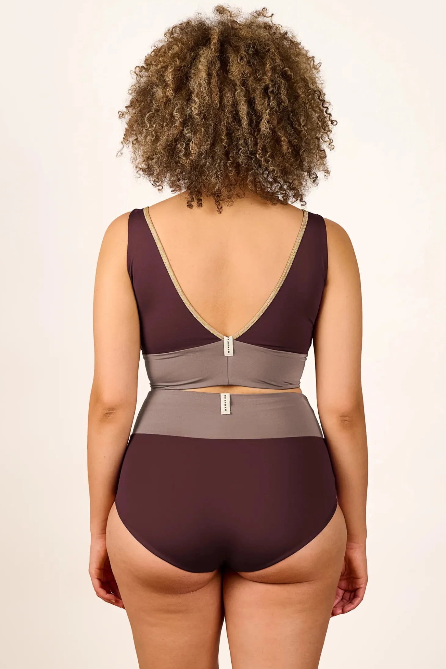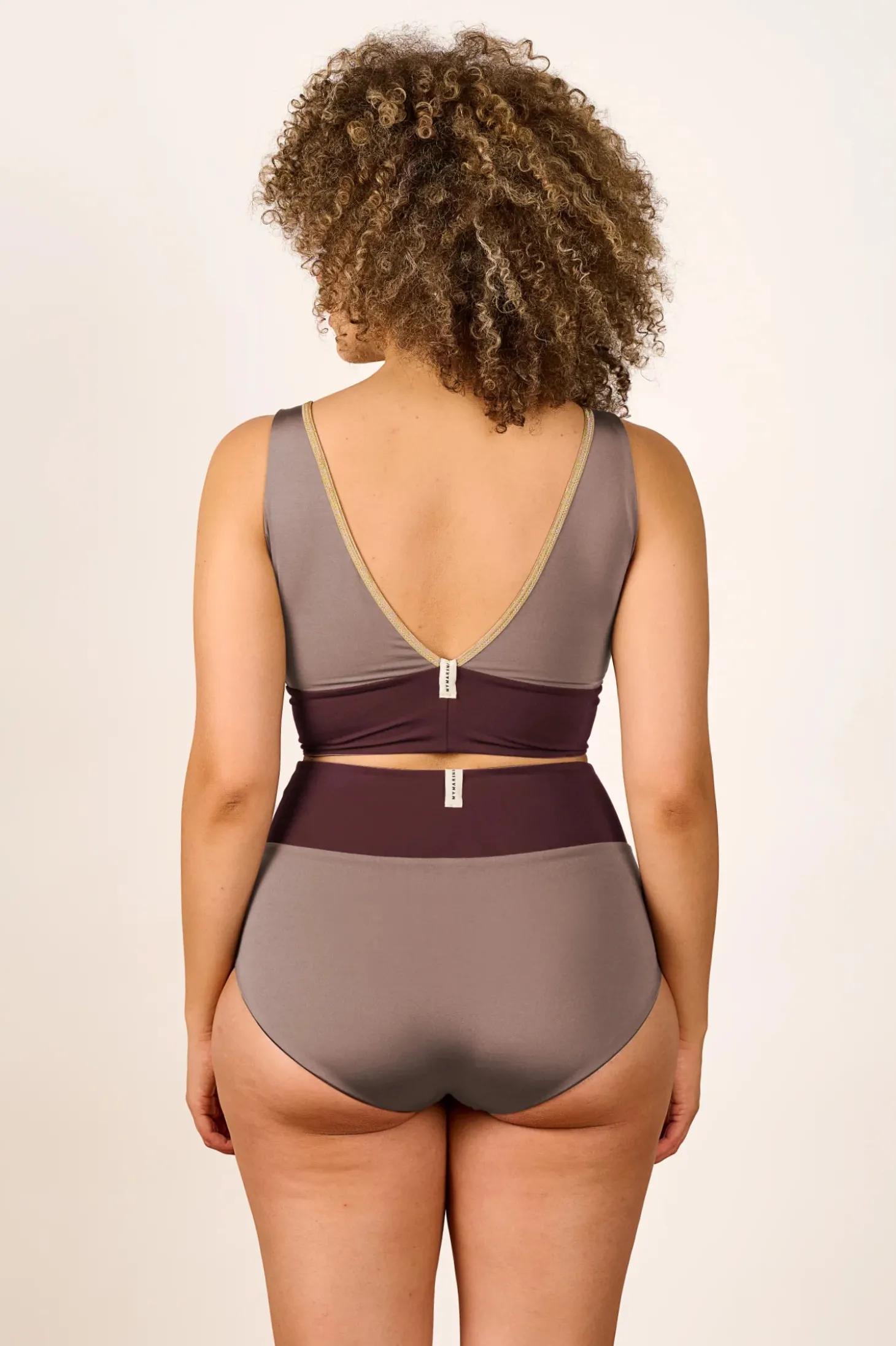 The shimmery YOGA SET features a modern and sporty design with a sleek color-blocked pattern. The V-neck bikini top has wide straps for support, offering a flattering yet functional fit, while the high-waisted bottom provides great sun coverage. The muted colorways feature contrasting horizontal bands and delicate golden SHINE trim for a chic and structured appearance. The overall style of this bikini is minimalistic yet elegant, making it a great choice for relaxing and active beach days alike — and it’s reversible, so you get two unique looks in one.